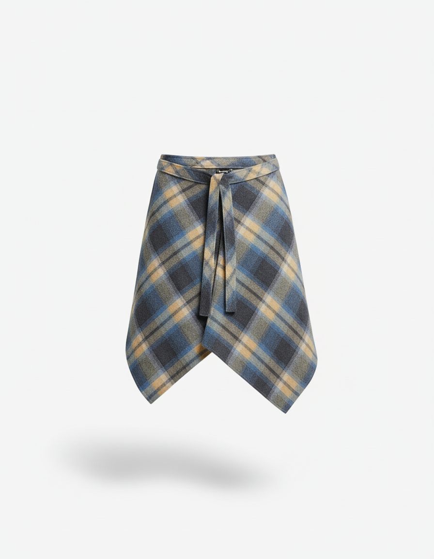 Cette jupe est un vêtement de type demi-corps avec un motif à carreaux et une coupe irrégulière. Elle est conçue comme une fausse jupe ou un faux ourlet de chemise.