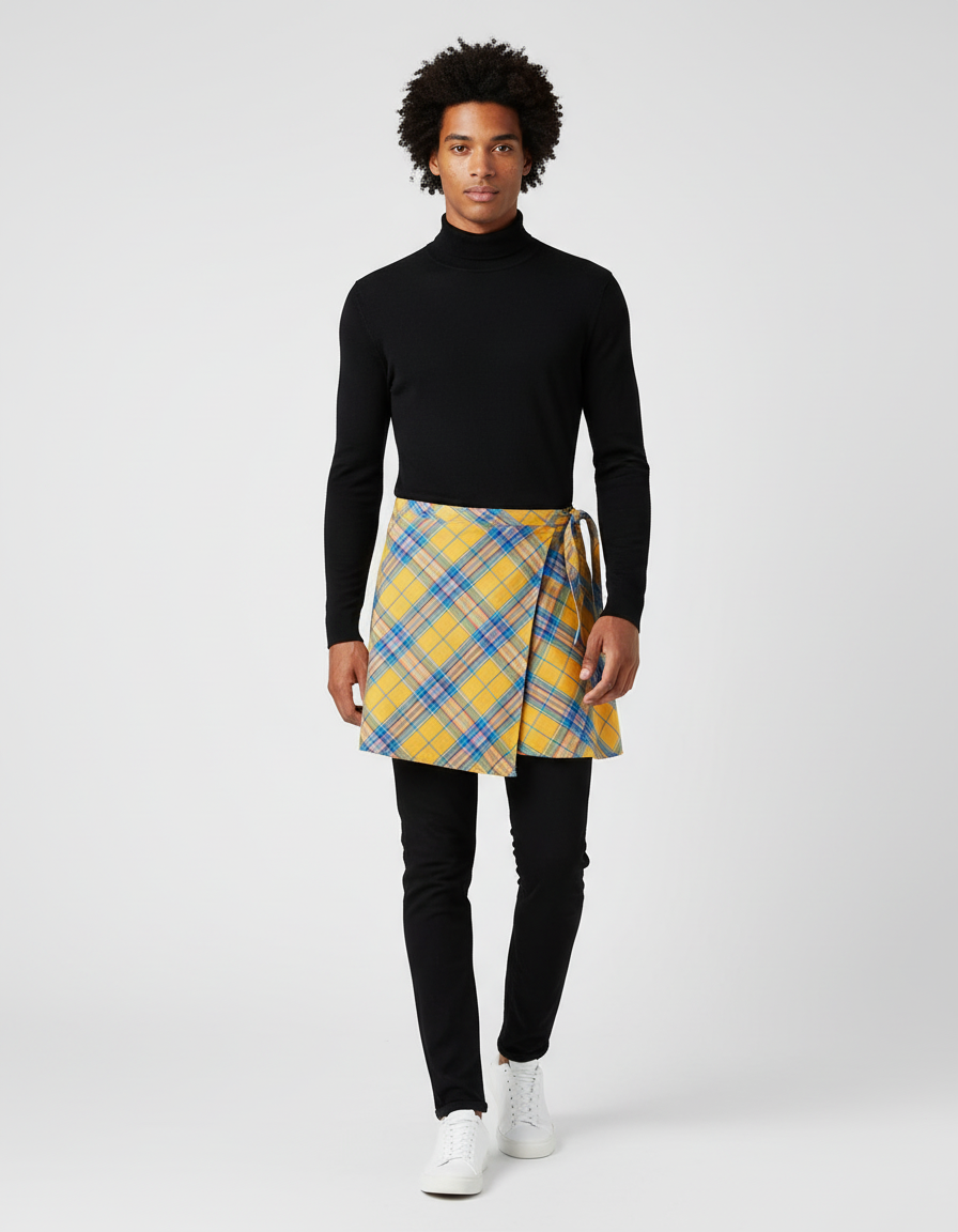 Adoptez un look audacieux et moderne avec notre jupe homme décontractée à carreaux jaunes.