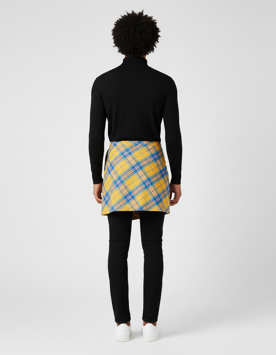 Cette jupe homme de style portefeuille présente un motif à carreaux jaune et bleu. Elle est conçue pour être portée comme une jupe demi-corps.