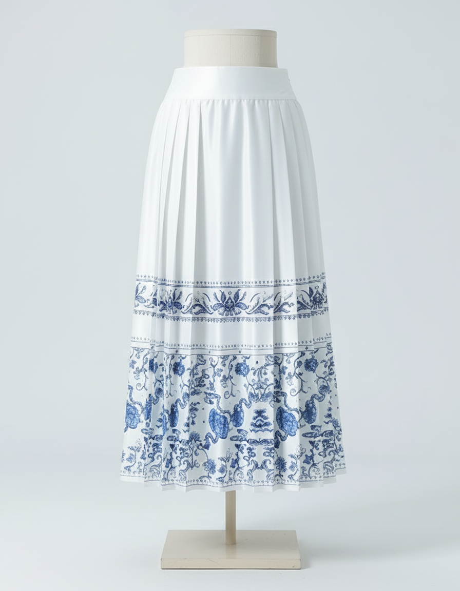 Cette Jupe Homme Blanche Motif Chinois Plissée est une jupe longue de couleur blanche, présentant un design plissé sur la partie supérieure et des motifs bleus d'inspiration chinoise sur le bas.
