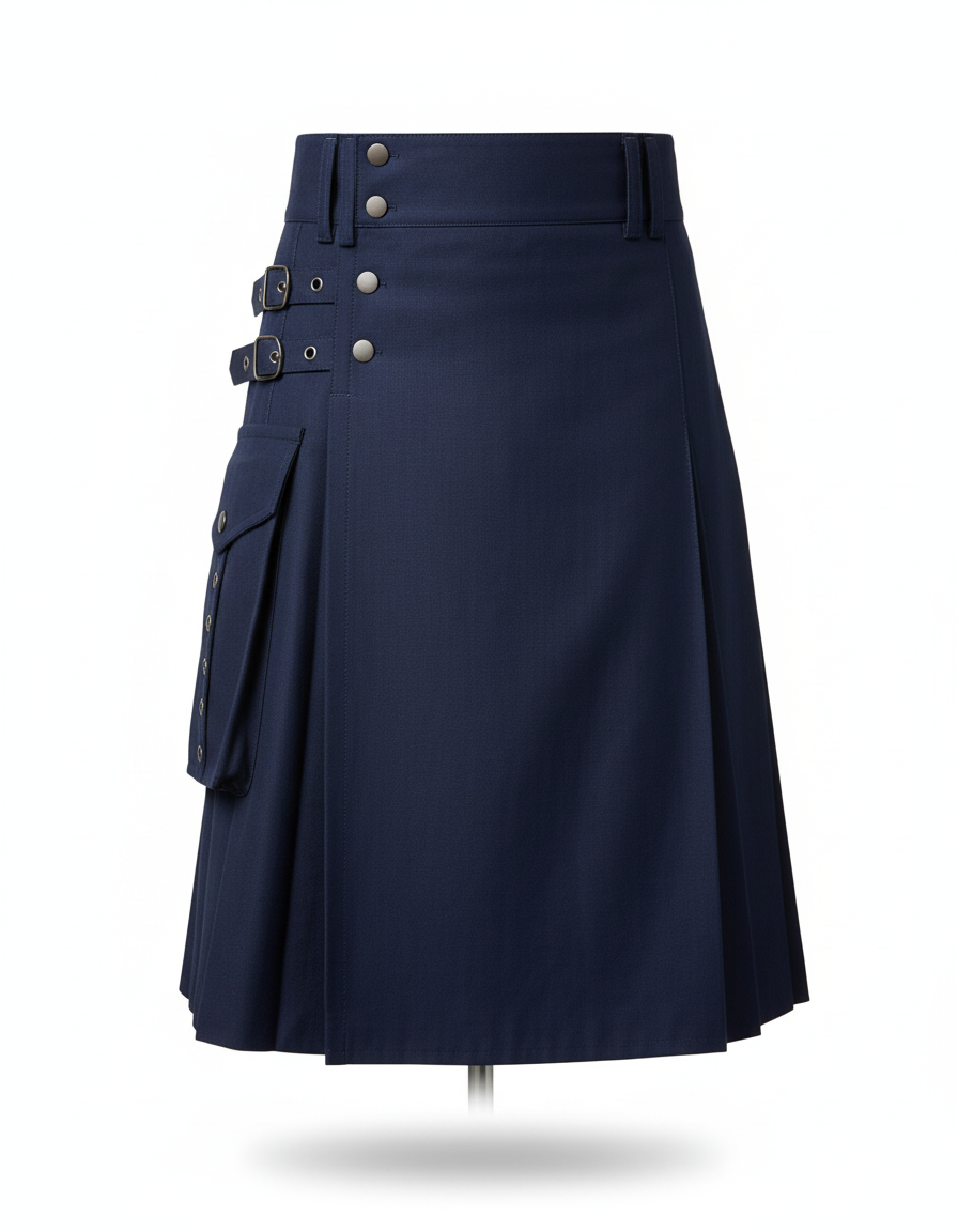 Cette jupe homme est de couleur bleu marine, caractérisée par une coupe plissée et des fermetures latérales.