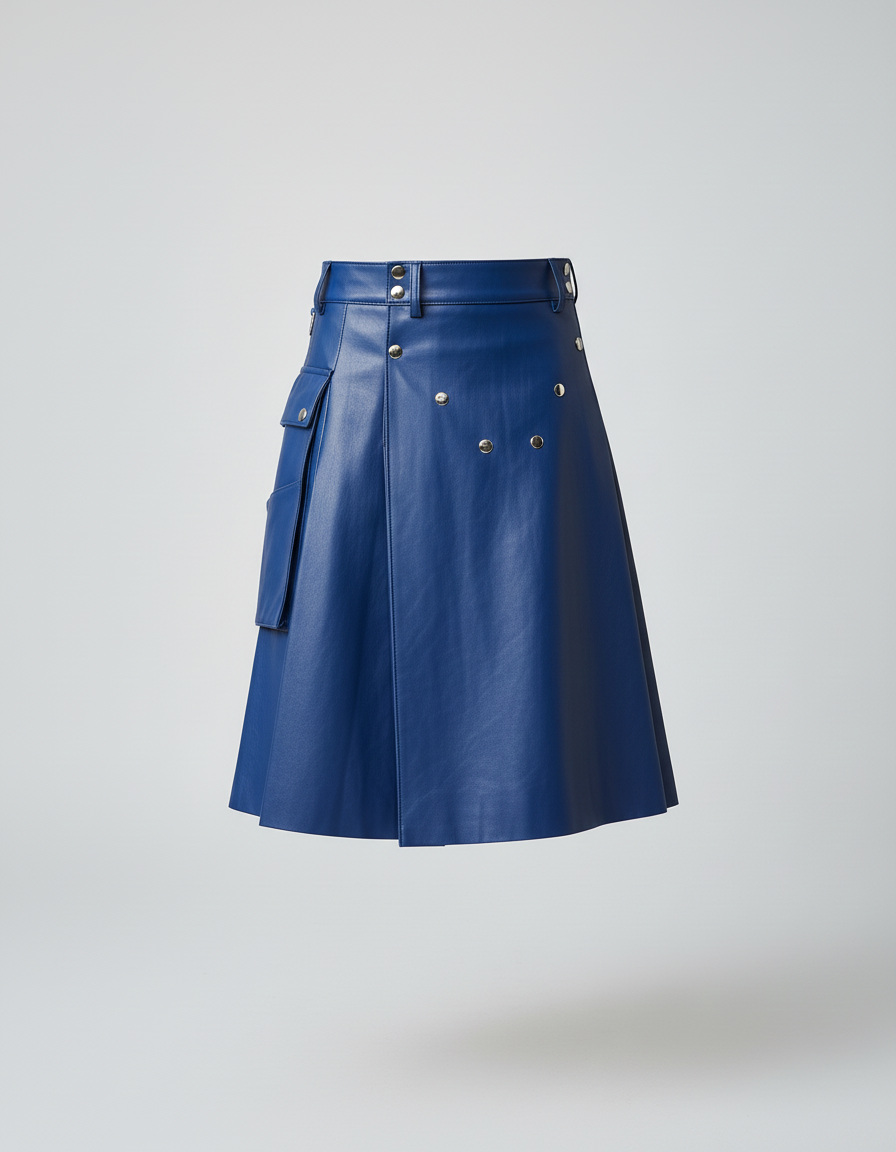 Façonnée dans un similicuir premium d'un bleu électrique saisissant, cette jupe se distingue par son plissé impeccable et sa texture luxueuse. Chaque détail, des finitions métalliques discrètes à la coupe structurée qui tombe parfaitement au genou, a été pensé pour allier confort et esthétique rock. Loin des conventions, elle propose une alternative raffinée aux silhouettes masculines traditionnelles, promettant non seulement un look unique mais aussi une durabilité et un entretien facilités, pour un luxe concret et intemporel.