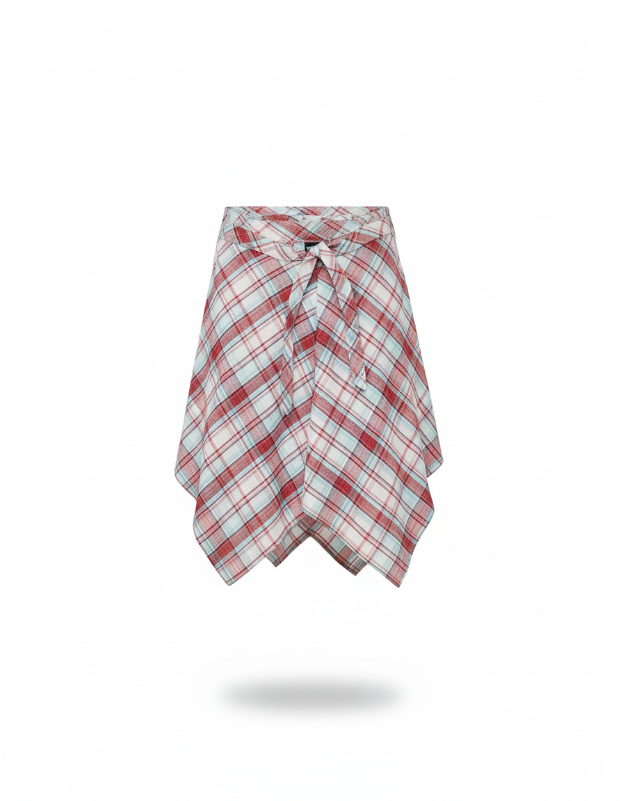 Cette jupe homme est dotée d'un motif écossais combinant des teintes de rouge, blanc et bleu clair. Sa conception présente une coupe irrégulière qui imite l'aspect d'une chemise nouée à la taille.