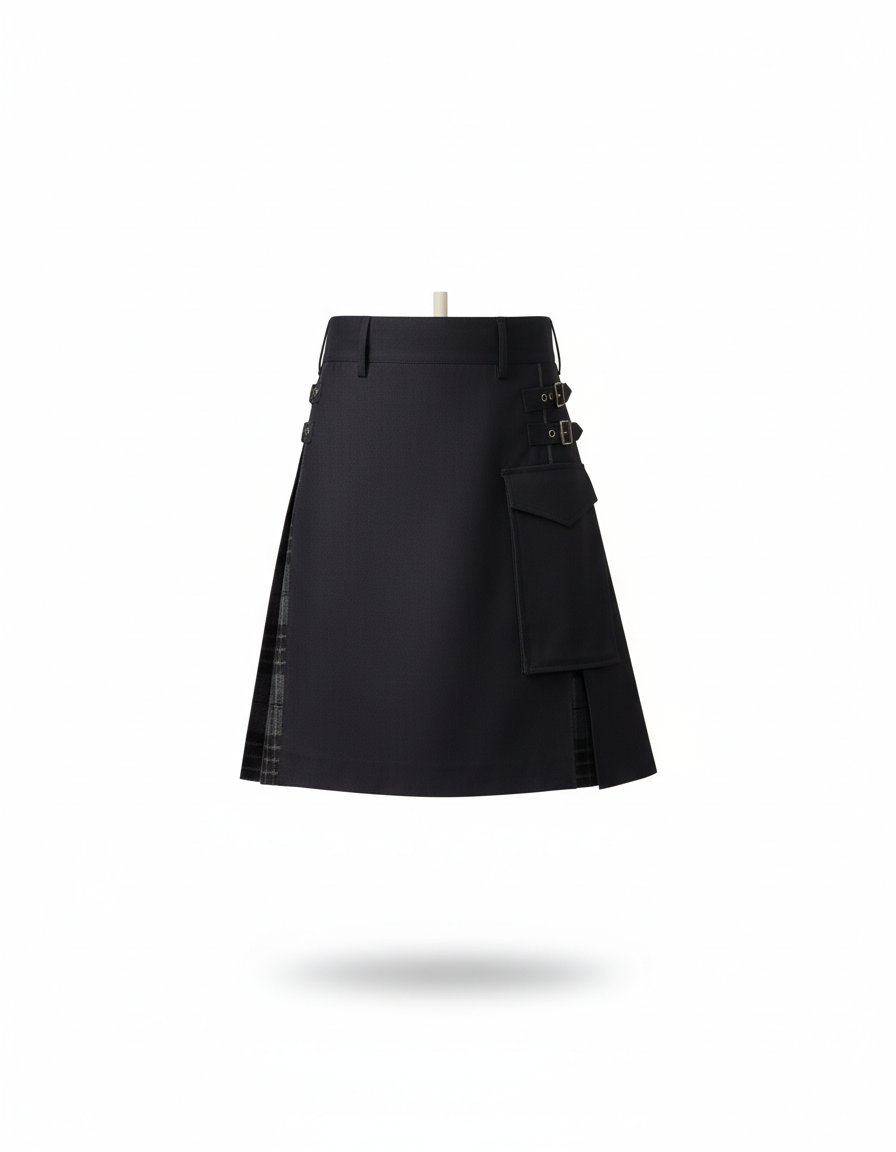 Cette jupe homme de style écossais se caractérise par une partie frontale unie et des plis latéraux et arrière avec un motif à carreaux contrastant. Elle est équipée d'une poche latérale à rabat et de fermetures à boucles.
