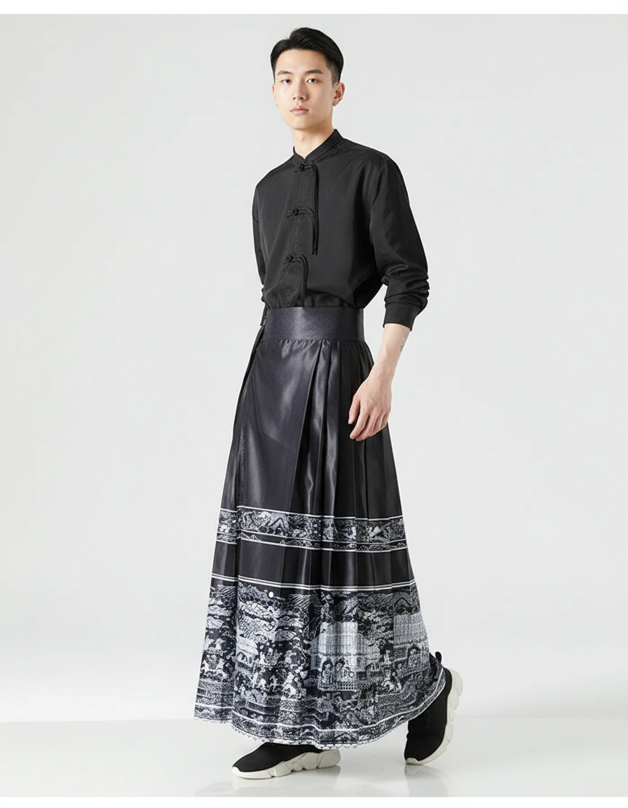 Cette jupe homme est de couleur noire, longue et présente des plis réguliers. Elle est ornée de motifs monochromes sur sa partie inférieure et dispose d'une ceinture large.