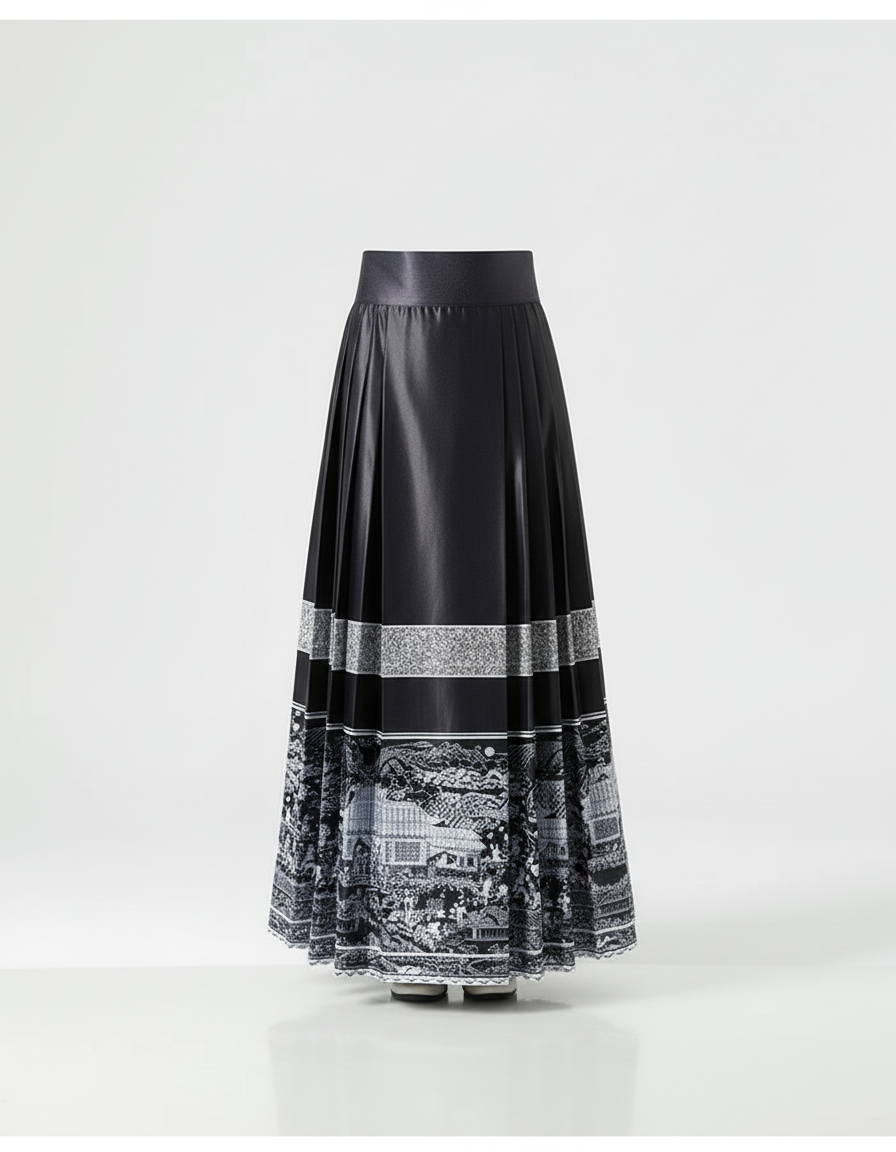 - Motifs : Motifs détaillés blancs et noirs représentant des paysages et des scènes architecturales sur la partie inférieure de la jupe.