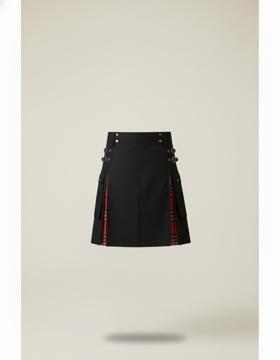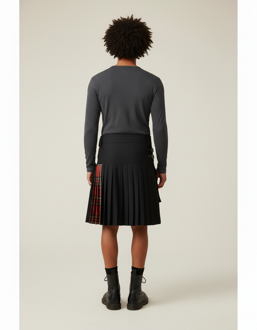 Cette jupe homme présente une coupe droite avec des empiècements à motif écossais rouge et noir visibles sur les côtés. Elle est principalement de couleur noire et arrive au-dessus du genou.