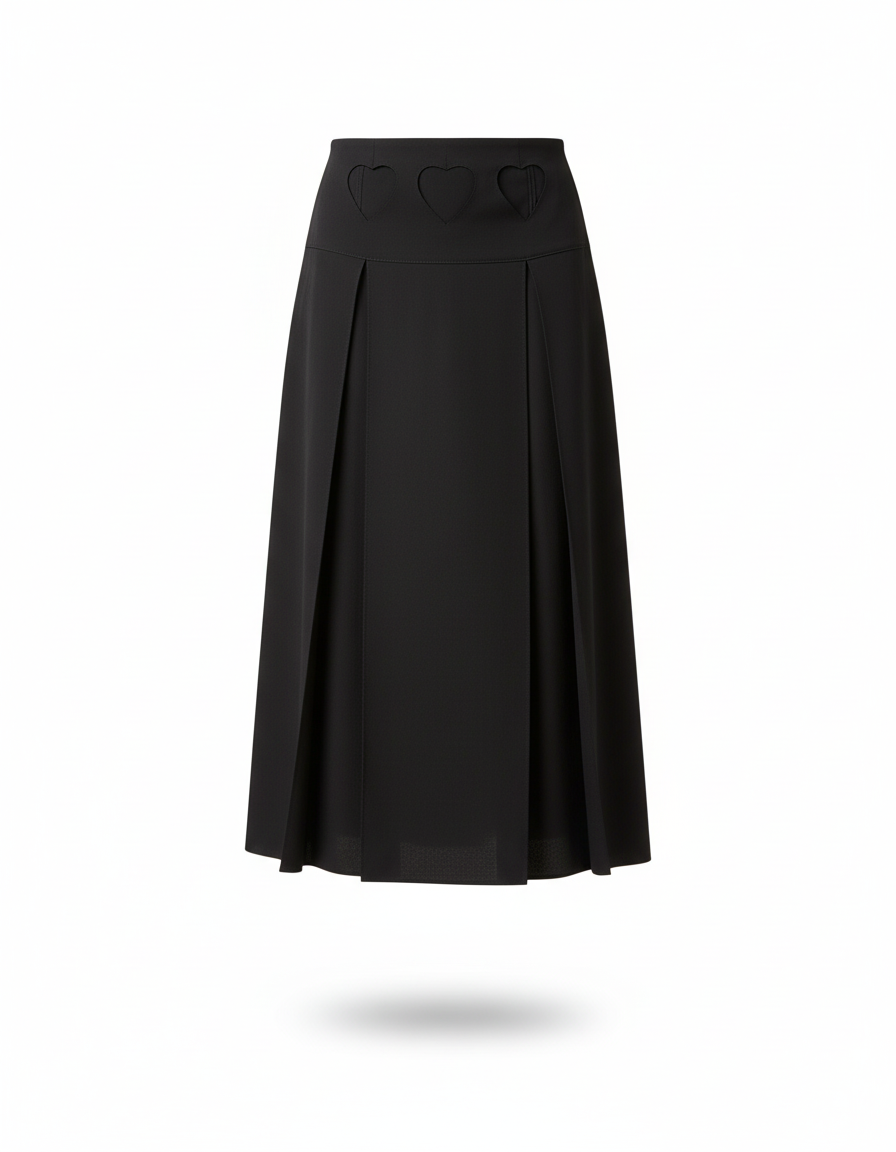 Fabriquée dans un polyester de haute qualité, cette jupe noire intemporelle se distingue par ses plis impeccables qui confèrent une silhouette fluide et structurée. Son design décontracté est sublimé par une touche d'originalité subtile : des découpes en forme de cœur discrètement intégrées à la ceinture, ajoutant une note de caractère unique. C'est l'alliance parfaite entre le raffinement d'une confection haut de gamme et la praticité d'un entretien facile, vous garantissant une allure impeccable sans effort. Osez l'expression d'un luxe moderne, concret et profondément personnel.