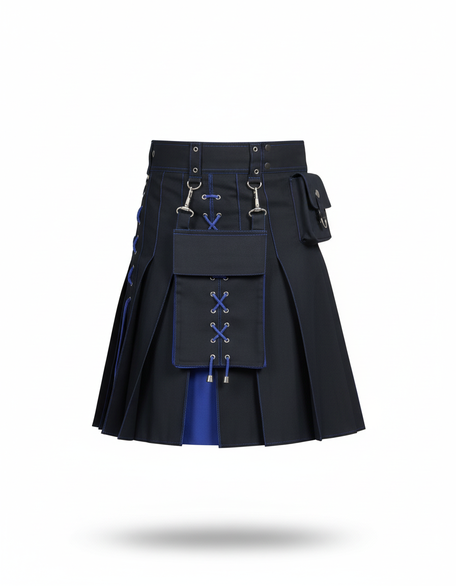 Cette Jupe Homme Plissée Bicolore Utilitaire est un kilt hybride moderne. Elle présente une conception plissée avec des détails utilitaires et une fermeture à lacets.