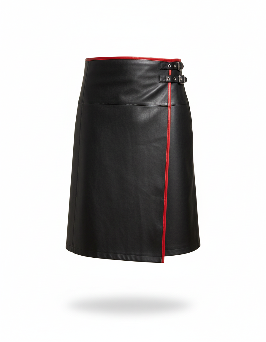 Son design portefeuille en simili cuir noir de haute qualité offre une silhouette structurée et moderne, tandis que le subtil liseré rouge apporte une touche rock distinctive et audacieuse. Chaque détail, des boucles métalliques à la coupe impeccable, est pensé pour un confort optimal et une esthétique irréprochable. Facile à associer avec un pull en maille décontracté ou une chemise plus ajustée, cette jupe est bien plus qu'un vêtement : c'est une déclaration de style. Adoptez-la et démarquez-vous avec une élégance inédite.