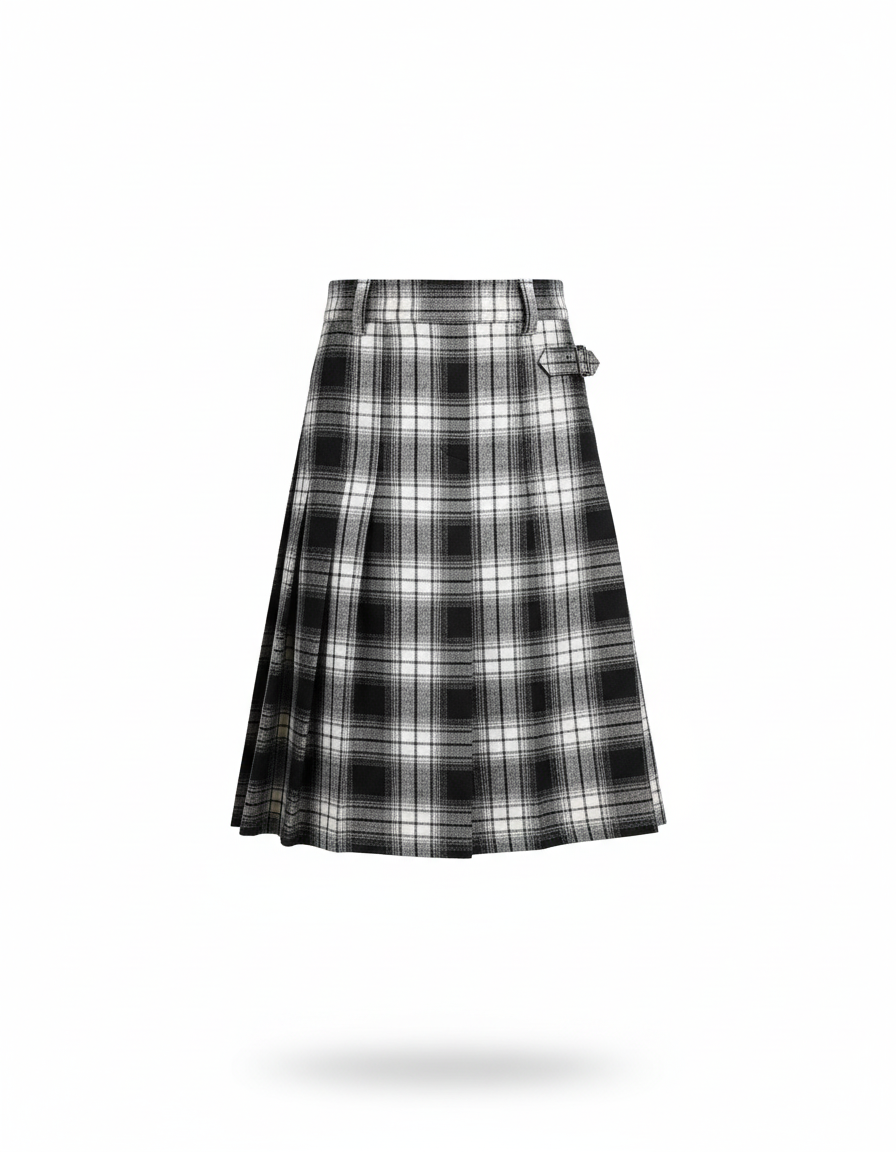 Cette jupe homme présente un motif écossais à carreaux noirs et blancs, avec des plis et une poche latérale.