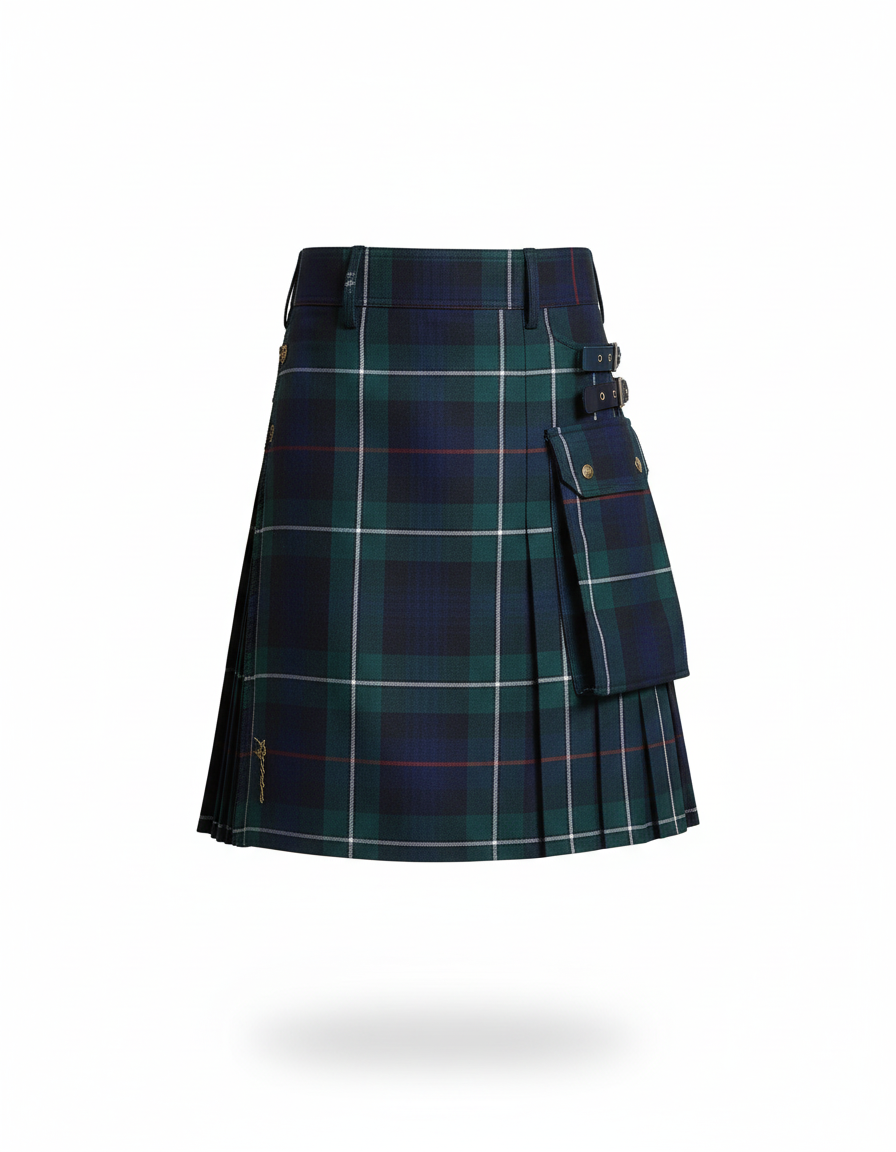 - Détails: Boucles latérales, poche latérale de type sporran avec boutons, épingle de kilt décorative.